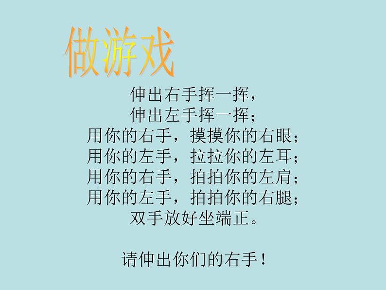 展开伸出右手挥一挥,伸出左手挥一挥;用你的右手,摸摸你的右眼;用你的左手,拉拉你的左耳;用你的右手,拍拍你的左肩;用你的左手,拍拍你的右腿;双手放好坐端正。请伸出你们的右手!