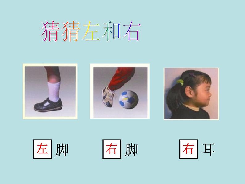 2020-2021学年五、 几何小实践左与右备课ppt课件: 这是一份2020-2021学年五、 几何小实践左与右备课ppt课件,共17页。PPT课件主要包含了游戏听口令做动作,伸出右手,伸出左手,抬起左脚,抬起右脚,摸摸右耳朵,摸摸左耳朵,左与右,看图说一说,判别左右等内容,欢迎下载使用。