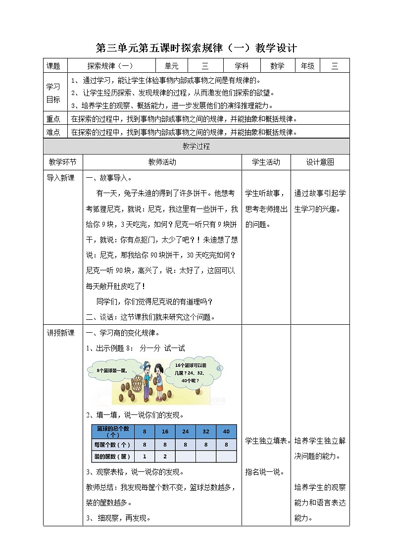 第三单元第五课时探索规律(一)教学设计课题 探索规律(一)单元三学科数学年级三学习目标1、 通过学习,能让学生体验事物内部或事物之间是有规律的。2、 让学生经历探索、发现规律的过程,从而激发他们探索的欲望。3、培养学生的观察、概括能力,进一步发展他们的演绎推理能力。重点在探索的过程中,找到事物内部或事物之间的规律,并能抽象和概括规律。难点在探索的过程中,找到事物内部或事物之间的规律,并能抽象和概括规律。 教学过程教学环节教师活动学生活动设计意图导入新课一、故事导入。 有一天,兔子朱迪的得到了许多饼干。他想考考狐狸尼克,就说:尼克,我这里有一些饼干,我给你9块,3天吃完,如何?尼克一听只有9块饼干,就说:你有点抠门,太少了吧?!朱迪想了想说:尼克,那我给你90块饼干,30天吃完如何?尼克一听90块,高兴了,说:太好了,这回可以每天敞开肚皮吃了! 同学们,你们觉得尼克说的有道理吗?二、谈话:这节课我们就来研究这个问题。 学生听故事,思考老师提出的问题。 通过故事引起学生学习的兴趣。讲授新课一、学习商的变化规律。1、出示例题8: 分一分 试一试2、填一填,说一说你们的发现。3、观察表格,说一说你的发现。教师总结:我发现每筐个数不变,篮球总数越多,装的筐数越多。3、 细观察,再发现。 1)教师提出要求:从上往下看,你发现了什么规律? 从下往上看呢?2)教师根据学生的汇报总结:从上往下看,除数不变,被除数扩大,商也扩大。从下往上看,除数不变,被除数缩小,商也缩小。5、议一议:你 发 现 了 什 么 规 律 ? 教师根据学生的汇报总结:除数不变,被除数扩大(或缩小)到原来的几倍,商就扩大(或缩小)到原来的几倍。(0除外) 6、试一试40÷2= 40÷4= 40÷8=7、教师提问:从左边的计算中,你发现了什么?8、议一议:你 发 现 了 什 么 规 律 ?教师总结: 被除数不变,除数扩大(或缩小)到原来的几倍,商就缩小(或扩大)到原来的几倍。(0除外) 9、小结:这两个都是商的变化规律。二、课堂活动。1、在钉板上围面积为72cm²的长方形,围一围,再填写下表。你发现了什么规律?2、说 一 说:你 发 现 了 什 么 规 律 ?教师根据学生的汇报总结:一个因数扩大几倍,则另一个因数要缩小相同的倍数,这样积不变。 三、课堂练习。 1、选 一 选。1)被除数乘20,要使商不变,除数应当( )。 A、除以20 B、乘20 C、乘40 2)56÷7=8,如果被除数乘2,商会是( )。 A、4 B、16 C、8 2、 判 断 对 错。1)被除数不变,如果除数除以3,商也会除以3。 ( ) 2)两数相除的商是20,被除数和除数同时乘2,商是40。( ) 3)被除数和除数同时除以5,商应乘25 。 ( ) 4)被除数扩大到原来的6倍,除数除以6,商不变。 ( )3、利用规律,看谁算得又对又快。81 ÷9= 320÷4= 56÷7=810 ÷9= 320÷8= 560÷70=8100÷9= 320÷2= 5600÷700=44、根据上面的算式,在下面的括号里填上合适的数。(1)150÷50=3 (2)180÷3=60 ( )÷50=6 540÷9=( ) 30÷( )=3 1800÷( )=60 四、拓展提高。根据规定60÷30=2,你能写出多少个商是2 的除法算式? 如果不限制被除数的大小, 这样的算式有多少个?你能不能想出一个好办法? 学生独立填表。 指名说一说。 学生小组讨论,展示汇报。 学生小组讨论展示汇报。 学生独立完成。学生小组讨论展示汇报。 指名学生说一说。 学生自己填表。 学生小组讨论,展示汇报。 学生独立完成。 培养学生独立解决问题的能力。 培养学生的观察能力和语言表达能力。 通过小组内合作完成,培养学生的观察能力和语言表达能力。培养学生的合作意识,体验合作学习的愉悦感。 培养学生独立解决问题的能力。 有了上面的基础,让学生自己总结出规律,培养学生的总结能力和语言表达能力。 过小组内合作完成,培养学生的观察能力和语言表达能力。培养学生的合作意识,体验合作学习的愉悦感。 对本节课内容进行巩固练习。 1、巩固练习商的变化规律。 2、帮助学生区分易混易错的概念和计算。 帮助学生确定商的位置。 3、利用商的变化规律进行计算。巩固商的变化规律。 利用商变化的规律解决问题。 课堂小结通过刚才的学习,你有什么收获? 我学会了商的变化规律。 板书探索规律(一)