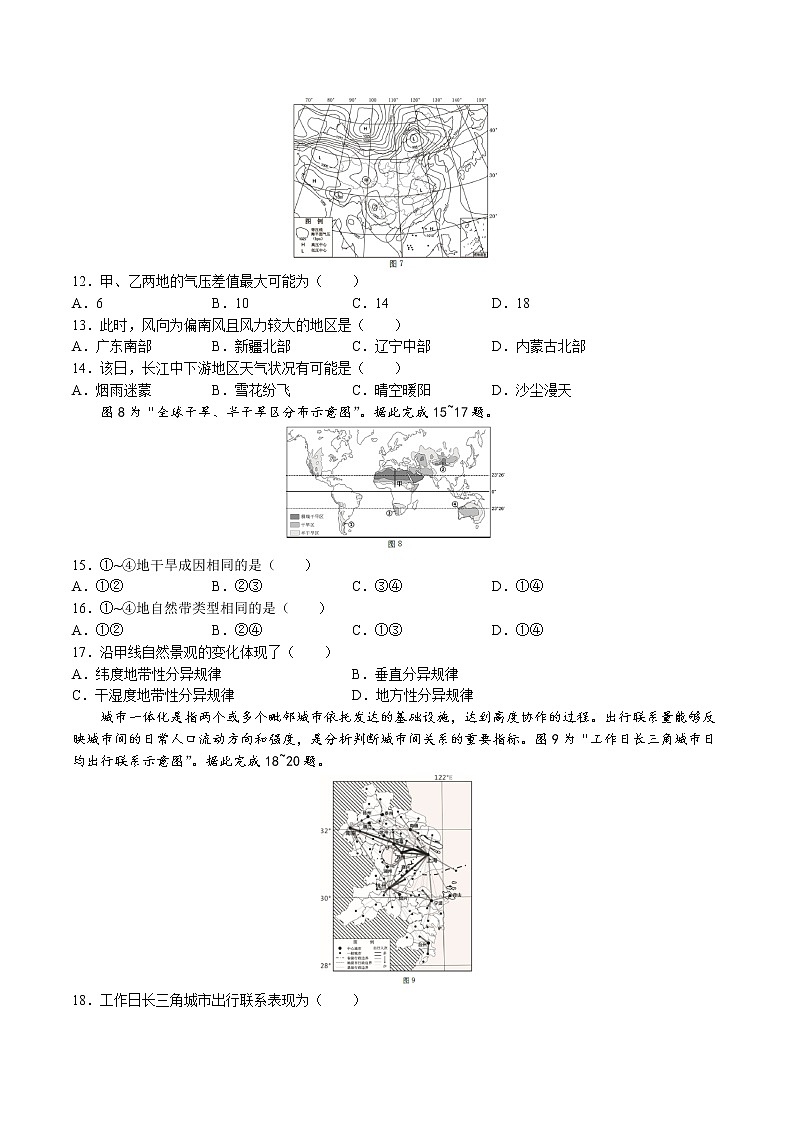 2022~2023学年度高三年级第一学期期末模拟测试地 理注意事项考生在答题前请认真阅读本注意事项及各题答题要求:1.本试卷共8页,满分为100分,考试时间为75分钟。考试结束后,请将答题卡交回。2.答题前,请务必将自己的姓名、准考证号用0.5毫米黑色墨水的签字笔填写在试卷及答题卡的规定位置。3.请认真核对监考员在答题卡上所粘贴的条形码上的姓名、准考证号与本人是否相符。4.作答选择题,必须用2B铅笔将答题卡上对应选项的方框涂满、涂黑;如需改动,请用橡皮擦干净后,再选涂其它答案。作答非选择题,必须用0.5毫米黑色墨水的签字笔在答题卡上的指定位置作答,在其它位置作答一律无效。5.如需作图,必须用2B铅笔绘、写清楚,线条、符号等须加黑、加粗。一、选择题:共22题,每题2分,共44分。每题只有一个选项最符合题意。 小明用观测日影的方法估算学校的经度。以插杆点为圆心,上午某时刻在地面上画一个半径略小于当时杆影长度的半圆,当上午杆影的影端落在圆周上时标记为A点,下午杆影的影端又落在圆周上时,再标记为B点。图1为“小明的观测笔记”。据此完成1~3题。1.该日,学校的正午太阳高度约为( )A.30° B.40° C.50° D.60°2.笔记中的甲~丁四点,最有可能表示该日正午杆影影端位置的是( )A.甲 B.乙 C.丙 D.丁3.笔记标注的A、B两点的时刻为北京时间,该地经度约为( )A.90°E B.105°E C.110°E D.135°E 骑田岭属于南岭山系,山势浑圆,山体主要由花岗岩构成。图2为“骑田岭景观图”,图3为“岩石圈物质循环示意图”。据此完成4~5题。4.骑田岭的岩石按成因属于( )A.甲 B.乙 C.丙 D.丁5.骑田岭地貌景观形成的地质作用过程大致是( )A.岩浆喷发→地壳抬升→变质作用 B.地壳抬升→岩浆侵入→外力作用C.岩浆侵入→地壳抬升→风化侵蚀 D.岩浆喷发→流水侵蚀→地壳抬升 图4为“塞浦路斯岛位置示意图”,图5为“尼科西亚的气温、降水统计图”。据此完成6~8题。6.尼科西亚的气候特征为A.夏季温和干燥,冬季温暖湿润 B.夏季温和少雨,冬季低温多雨C.夏季炎热少雨,冬季寒冷多雨 D.夏季炎热干燥,冬季温和湿润7.甲~丁四地中降水最多的是( )A.甲 B.乙 C.丙 D.丁8.该岛上河流均为时令河的主要原因是( )A.年降水量较少、早季长且流域面积小 B.夏季气温高,河流蒸发旺盛C.以冰雪融水补给为主,冬季消融量少 D.植被稀少,涵养水源作用弱 某科研团队在金沙江干热河谷中研究不同植被对坡面土壤水分的影响。研究区多年平均蒸发量离达3847.8mm,年平均降雨量仅为634mm;三种植被区所在位置邻近、坡向与海拔相同。图6为“三种植被区坡面土壤水分随深度变化统计图”。据此完成9~11题。9.该地土壤水分含量( )A.森林植被区雨季均大于旱季 B.同一季节灌丛地均大于草地C.旱季深度越大水分含量越大 D.雨季深度越大水分含量越小10.导致灌丛地与林地土壤水分含量差异的主要因素最可能是( )A.区域降水量 B.植被蒸腾量 C.土壤下渗量 D.坡面径流量11.为更好地保护生态环境,该地植被恢复最宜种植A.落叶阔叶树 B.湿生草甸 C.常绿阔叶树 D.旱生灌木图7为“2022年4月25日14时亚洲部分地区地面天气简图”。据此回答12~14题。12.甲、乙两地的气压差值最大可能为( )A.6 B.10 C.14 D.1813.此时,风向为偏南风且风力较大的地区是( )A.广东南部 B.新疆北部 C.辽宁中部 D.内蒙古北部14.该日,长江中下游地区天气状况有可能是( )A.烟雨迷蒙 B.雪花纷飞 C.晴空暖阳 D.沙尘漫天 图8为“全球干旱、半干旱区分布示意图”。据此完成15~17题。15.①~④地干旱成因相同的是( )A.①② B.②③ C.③④ D.①④16.①~④地自然带类型相同的是( )A.①② B.②④ C.①③ D.①④17.沿甲线自然景观的变化体现了( )A.纬度地带性分异规律 B.垂直分异规律C.干湿度地带性分异规律 D.地方性分异规律 城市一体化是指两个或多个毗邻城市依托发达的基础设施,达到高度协作的过程。出行联系量能够反映城市间的日常人口流动方向和强度,是分析判断城市间关系的重要指标。图9为“工作日长三角城市日均出行联系示意图”。据此完成18~20题。18.工作日长三角城市出行联系表现为( )A.跨省城市之间联系较少 B.空间距离越近联系越多C.沿海城市间联系最紧密 D.大城市间联系较为紧密19.下列城市间最具备城市一体化基础条件的是( )A.南京—镇江—扬州 B.苏州—无锡—常州C.南通—泰州—扬州 D.绍兴—宁波—舟山20.影响工作日长三角城市出行量的主要因素是A.旅游资源数量 B.商业繁荣程度C.区域经济联系 D.科教文化水平 1967年,巴西为了促进南北部地区均衡发展,把自贸区设立在西北内陆小城玛瑙斯。经过几十年的发展,数百家跨国公司在该区投资,我国某知名空调企业也在该地建立了生产基地。图10为“玛瑙斯位置示意图”。据此完成21~22题。21.与巴西东南沿海的大城市相比,玛瑙斯成为众多跨国企业投资地的主要原因是( )A.水源更为丰富 B.水运较为便利C.劳动力更充足 D.生产成本较低22.推测我国知名空调企业在此地生产的产品主要面向的市场是( )A.非洲 B.欧洲 C.北美洲 D.拉丁美洲二、非选择题:共3题,共56分。23.阅读材料,回答下列问题。(20分) 材料一 皇甫川地处黄土高原与鄂尔多斯高原的过渡地带,是黄河晋陕段支流。流域内梁峁起伏、沟壑纵横。1972年以来,该地逐步推进淤地坝建设;2000年后,流域内实施退耕还林还草工程。 材料二 图11为“皇甫