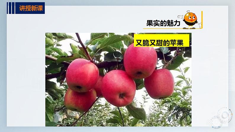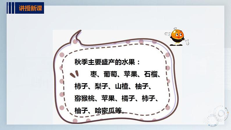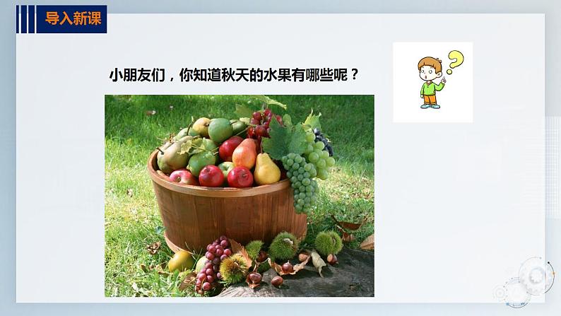 导入新课 | 1、同学们,你们喜欢吃水果吗? 2、秋天到了,果园里的水果也多了起来,小朋友们你知道秋天的水果有哪些呢? 秋季主要盛产的水果: 枣、葡萄、苹果、石榴、柿子、梨子、山楂、柚子、猕猴桃、苹果、橘子、柿子、柚子、哈密瓜等。
