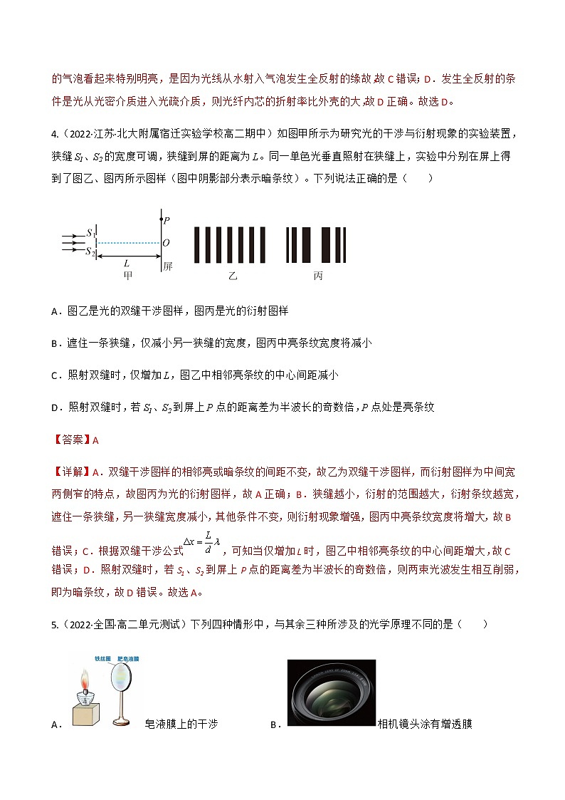 【详解】A.双缝干涉图样的相邻亮或暗条纹的间距不变,故乙为双缝干涉图样,而衍射图样为中间宽两侧窄的特点,故图丙为光的衍射图样,故A正确;B.狭缝越小,衍射的范围越大,衍射条纹越宽,遮住一条狭缝,另一狭缝宽度减小,其他条件不变,则衍射现象增强,图丙中亮条纹宽度将增大,故B错误;C.根据双缝干涉公式,可知当仅增加L时,图乙中相邻亮条纹的中心间距增大,故C错误;D.照射双缝时,若S1、S2到屏上P点的距离差为半波长的奇数倍,则两束光波发生相互削弱,即为暗条纹,故D错误。故选A。
