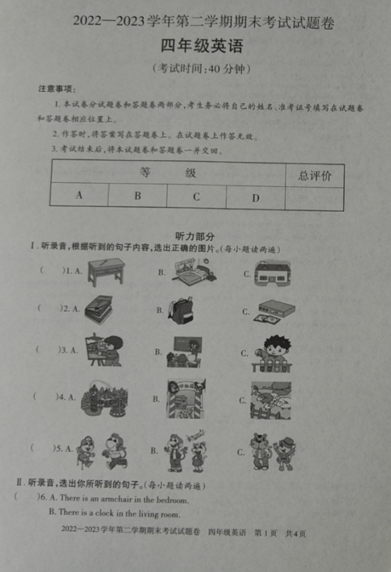 这是一份新疆阿勒泰地区2022-2023学年四年级下学期期末考试英语试题,共4页。