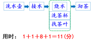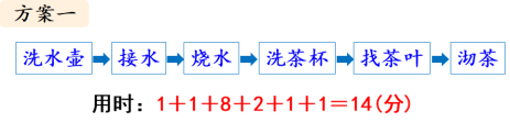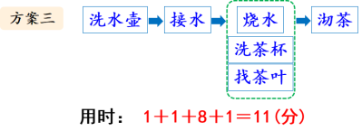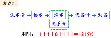 【学情预设】通过交流,学生能感受到在烧水的同时找茶叶、洗茶杯这种方法更省时间,这就是最优方案。