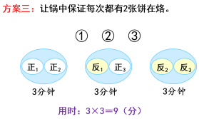【学情预设】学生会发现因为第二种烙法多烙了一次,其中有两次锅里只有1张饼,这就浪费了时间,而第三种烙法每次都保证了锅里有2张饼,没有让锅空出来,让时间浪费。最后学生们能统一认知:第一、二种方法虽然也是可行的方法,但是第三种方法用的时间更少,是最优方法。