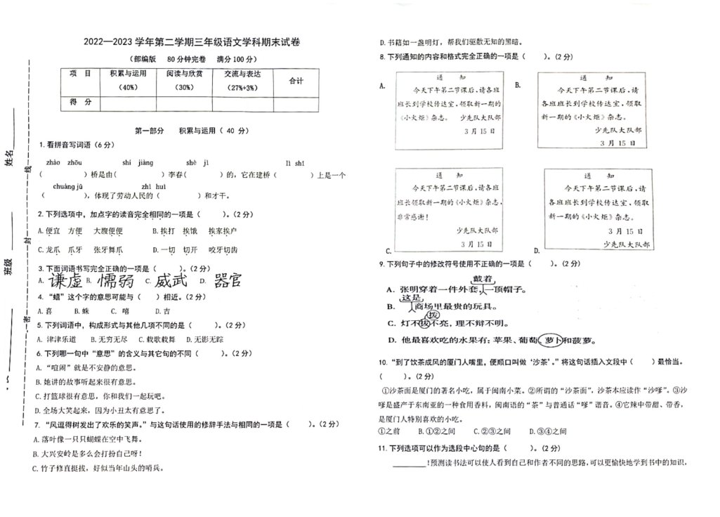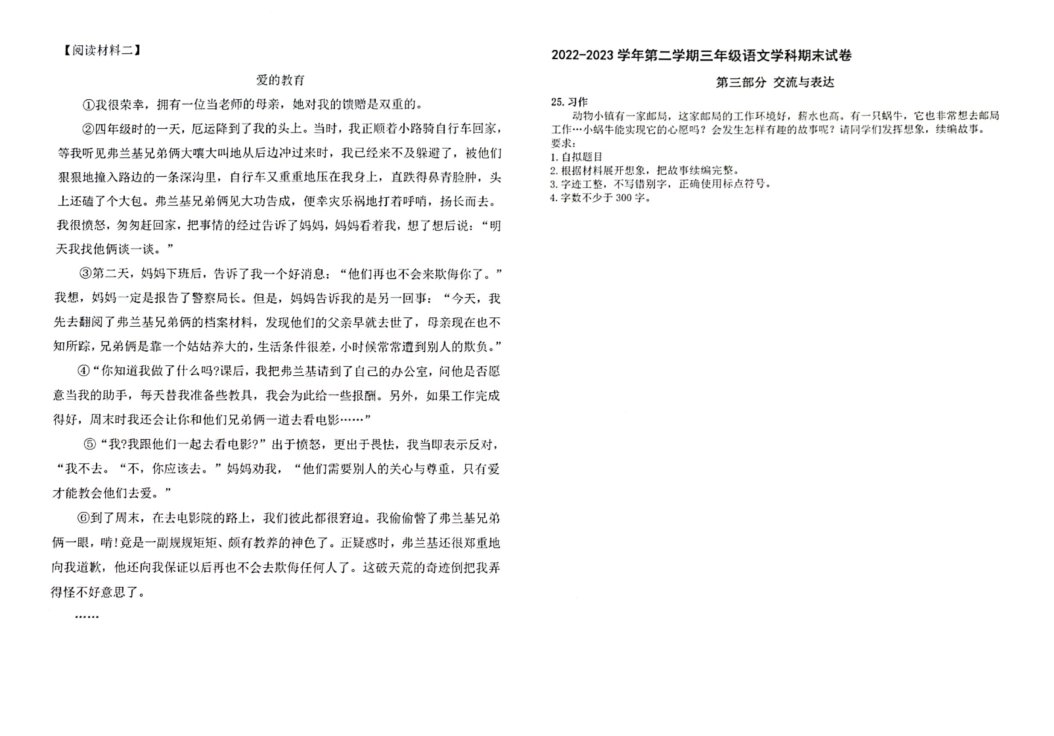 福建省厦门市思明区2022-2023学年三年级下学期期末考试语文试卷