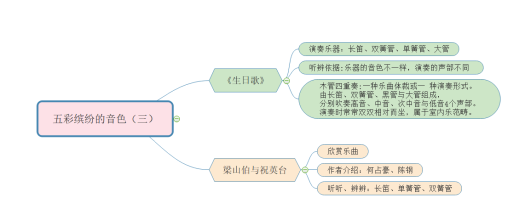 教学策略/教学思路:为引起学生更大的学习兴趣,巧妙地结合有较强歌唱性的主题音乐《梁祝》和愉悦情绪的《生日歌》,让学生边聆听不同乐器音色边享受音乐的美。