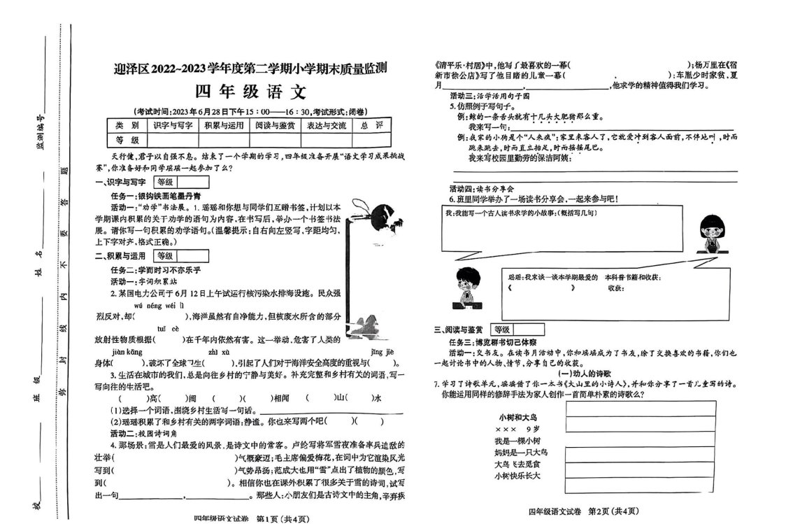 山西省太原市迎泽区2022-2023学年四年级下学期期末质量监测语文试卷