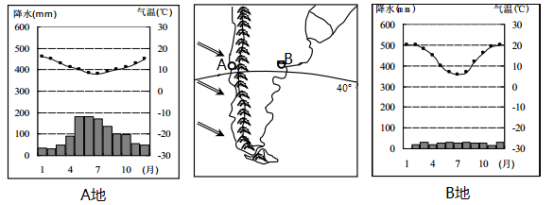 (本题4分)读安第斯山脉 南段图及A、B两地的气候资料图,完成下列各题。