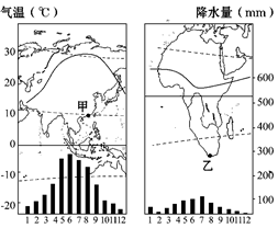 (本题4分)读世界两区域轮廓图及甲、乙两地月平均气温曲线和降水量柱状图,回答下面小题。