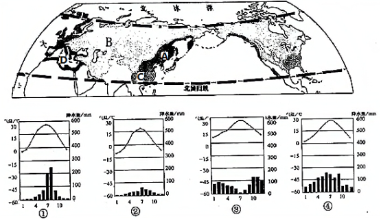 21.(本题2分)请将下图中A、B、C、D四地的气候类型与四幅“气温曲线降水柱状图”正确配对。