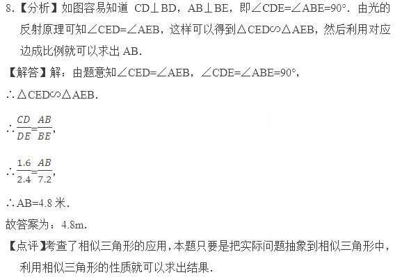 8.为了测量校园内一棵不可攀的树的高度,学校数学应用实践小组做了如下的探索:根据光的反射定律,利用一面镜子和皮尺,设计如图所示的测量方案:把镜子放在离树AB的树根7.2m的点E处,然后观测者沿着直线BE后退到点D,这时恰好在镜子里看到树稍顶点A,再用皮尺量得DE=2.4m,观测者目高CD=1.6m,则树高AB约是 .
