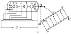 13.下图为一多级加速器模型,一质量为m=1.0×10-3 kg、电荷量为q=8.0×10-5 C的带正电小球(可视为质点)通过1、2级无初速度地进入第3级加速电场,之后沿位于轴心的光滑浅槽,经过多级加速后从A点水平抛出,恰好能从MN板的中心小孔B垂直金属板进入两板间,A点在MN板左端M点正上方,倾斜平行金属板MN、PQ的长度均为l=1.0 m,金属板与水平方向的夹角为θ=37°,sin 37°=0.6,cos 37°=0.8,重力加速度g取10 m/s2。