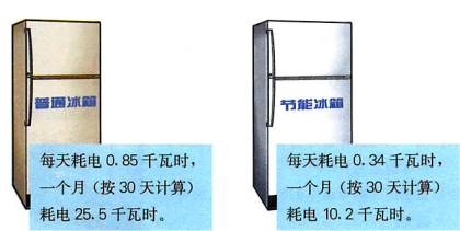 师:节能冰箱比较省电,每天耗电0.34千瓦时,0.34千瓦时也就是0.34度,千瓦时俗称度。普通冰箱比节能冰箱费电,每天耗电0.85千瓦时,节能冰箱比普通冰箱省电。节能冰箱每月耗电10.2千瓦时,普通冰箱每月耗电25.5千瓦时,节能冰箱比普通冰箱省电。