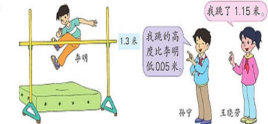 (1)孙宁跳过了多少米? (2)王晓芳跳的高度比李明低多少米? 指一指李明和王晓芳跳的高度是多少,再说说如何列算式,然后再计算。 生独立完成后交流: 小结:(1)题中,孙宁跳的高度比李明的低 0.05米,所以用减法计算。(2)题中求李明和王晓芳跳的高度的差距,所以用减法计算。 3、