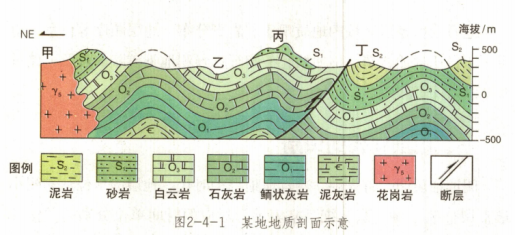 (3)如图2-4-1中,花岗岩侵入体切割的最新地层为下志留统(S)的砂岩,表明花岗岩侵人运动发生于早志留世之后。
