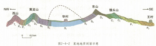 (2)如图2-4-1中, 各个年代的沉积岩层均发生褶皱,其中褶皱的最新地层是中志留统(S2) 的泥岩,说明该地区的褶皱发生在中志留世之后。