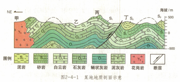 (1)以图2-4-1为例:丁处附近的下志留统(S,)、上奥陶统(O3)、中奥陶统(O2)、下奥陶统(O,)、寒武系(∈)地层被断层错断,断层切割的最新地层是下志留统(S),据此可以推断,丁处附近的断层发生在古生代下志留统地层形成之后,即早志留世之后。