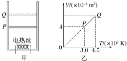 13.绝热的活塞与汽缸之间封闭一定质量的理想气体,汽缸开口向上置于水平面上,活塞与汽缸壁之间无摩擦,缸内气体的内能UP=72 J,如图甲所示.已知活塞横截面积S=5×10-4 m2,其质量为m=1 kg,大气压强p0=1.0×105 Pa,重力加速度g=10 m/s2,如果通过电热丝给封闭气体缓慢加热,活塞由原来的P位置移动到Q位置,此过程封闭气体的V-T图像如图乙所示,且知气体内能与热力学温度成正比.求: