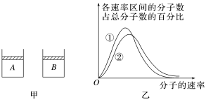 7.(2021·河北卷·15(1))两个内壁光滑、完全相同的绝热汽缸A、B,汽缸内用轻质绝热活塞封闭完全相同的理想气体,如图甲所示.现向活塞上表面缓慢倒入细沙,若A中细沙的质量大于B中细沙的质量,重新平衡后,汽缸A内气体的内能________(填“大于”“小于”或“等于”)汽缸B内气体的内能,图乙为重新平衡后A、B汽缸中气体分子速率分布图像,其中曲线________(填图像中曲线标号)表示汽缸B中气体分子的速率分布规律.