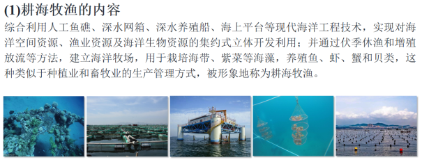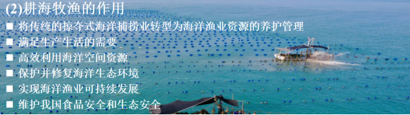 在海洋渔业资源枯竭、环境污染和生态系统退化的形势下,耕海牧渔将传统的掠夺式海洋捕捞业转型为海洋渔业资源的养护管理,在满足生产生活需要的同时,对高效利用海洋空间资源、保护并修复海洋生态环境、实现海洋渔业可持续发展、维护我国食品安全和生态安全具有重要意义。