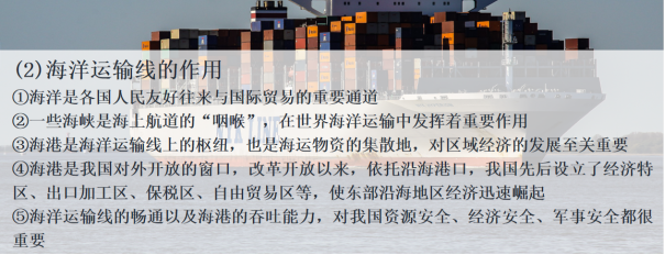 【老师】提问(展示):那同学们知道海洋运输线与国家安全又有什么联系?请同学们阅读教材第39页—40页,然后总结归纳。