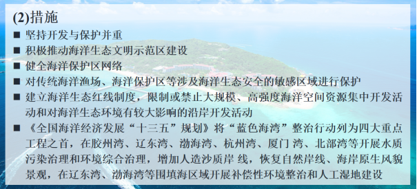 2. 措施:加强海洋生态的修复与保护,科学发展海洋渔业、海洋旅游等产业,探索生态优势与经济效益的有效转化路径,实现了人海共生、和谐互动的蓝色增长。