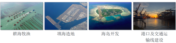 目前,海洋空间资源开发主要限于沿岸和近岸海域,开发方式主要有耕海牧渔、填海造地、海岛开发、港口及交通运输线建设等。
