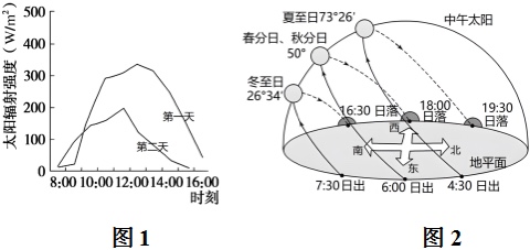 北京市某高中生12月份连续2天观测并绘制了太阳辐射强度变化图(图1),图2示意北京市太阳视运动轨迹。据此完成下面小题。