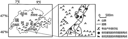 户外向导服务业能够为户外运动者提供专业的户外领队、行程规划、装备销售与保养等服务。瑞士拥有世界级的自然风光,每年吸引大量游客春赏花、夏避暑、秋赏叶、冬滑雪。苏黎世、伯尔尼、日内瓦等大城市为进出瑞士的门户。与门户城市相比,采尔马特小镇户外向导服务业更加发达,既有专业的户外旅行社,又有依托餐馆、民宿的向导服务网点。下图示意采尔马特小镇户外向导服务业的分布。据此完成下面小题。