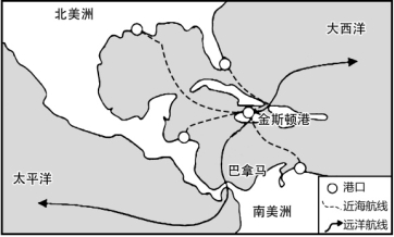 中转港是指货物从启航港到目的港过程中经济的第三港口,运输工具在该港口进行停靠、装卸货物和补给等,货物换装运输工具后继续运往目的港。牙买加首都金斯敦港是加勒比地区重要的中转港(见图),同时也是货物进出不需办理任何手续且不缴纳关税的自由港。据此完成下面小题。