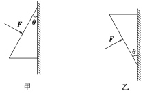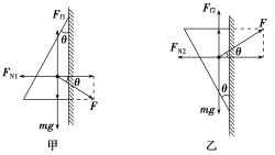 解析:轻质环a(不计重力)套在杆上,不计摩擦,则a静止时细绳的拉力与杆对a的弹力平衡,故拉a的细绳与杆垂直,a受到两个力作用,故A错误;对b球受力分析可知,b受到重力、绳子的拉力和杆对b球的弹力,b受到3个力的作用,故B错误;以b为研究对象,受力分析如图所示,根据几何关系可得β=θ=30°,则细杆对b的作用力大小FN等于细绳的拉力大小FT,则2FNcos 30°=mg,解得FN=mg,故C错误;对b分析,细绳的拉力大小FT=FN=mg,则细绳对a的拉力大小为mg,故D正确。答案:D12.如图甲所示,推力F垂直斜面作用在斜面体上,斜面体静止在竖直墙面上,若将斜面体改成如图乙所示放置,用相同大小的推力F垂直斜面作用到斜面体上,则下列说法正确的是( )