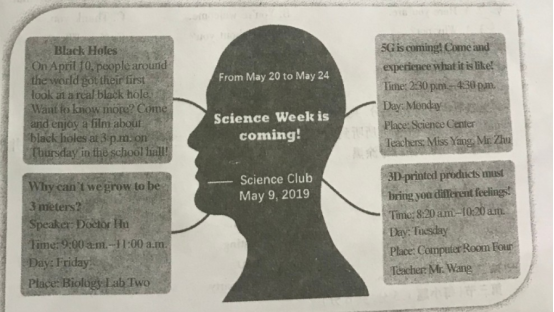 44. You can enjoy a film ____ on Thursday afternoon.A. in the school hall B. in Computer Room FourC. in Biology Lab Two D. in Science Center45. On Friday, ____ will tell you why we can't grow to be 3 meters.A. Mr. Wang B. Miss Yang C. Doctor Hu D. Mr. Zhu46. From 2 : 30 p. m. to 4 : 30 p. m. on Monday, you can ____.A. watch a film B. enjoy 3D-printed productsC. listen to a talk D. experience what 5G is like47. The material above is probably____.A. a notice B. a poem C. a map D. a diaryCCinyee Chiu, an artist from Taiwan, is always happy to try something new. Her amazing works won lots of prizes. Among them, “24 Solar Terms(节气)” is the most popular.Ancient Chinese divided a year into 24 parts according to the changes of the weather. It's the 24 solar terms. But not everyone knows them well. Cinyee Chiu put the 24 solar terns in pictures to help people understand them better.Cinyee turned each solar term into an animal. But these animals are not just animals. You can also find seasonal fruits, vegetables or beautiful flowers on them.When spring comes, water gets warm and fish start to swim around. So Cinyee chose fish as a symbol of Start of Spring. Also, she drew spring vegetables, Chinese chives on the back of the fish. White Dew falls on about Sept. 8. It shows the beginning of the cool autumn. There are colorful leaves and cooler nights at this time of year. As the temperature falls, white dew(露珠) is often seen on the grass and trees at night. For White Dew, Cinyee chose a raccoon—a small animal with thick hair. She drew white spots(小圆点) on the raccoon to show dew. And she used the dragon fruit to show the rich colors in autumn.The young artist really gave the ancient Chinese culture a new look.48. The writer gave ____ examples to show Cinyee’s “24 Solar Terms”.A. two B. three C. four D. five49. From Paragraph 5, we know that ____.A. a raccoon likes fish B. Start of Spring falls on about Dec. 8C. White Dew shows the end of the autumnD. Cinyee used white spots to show dew50. According too the passage, Picture ____ can’t be from Cinyee’s “24 Solar Terms”.