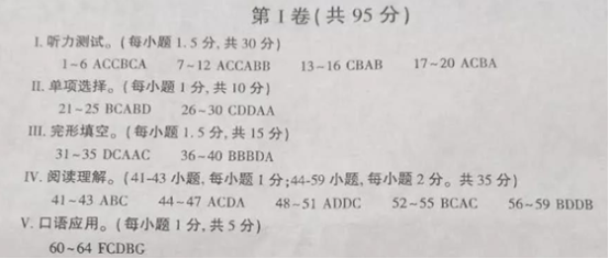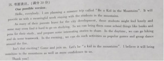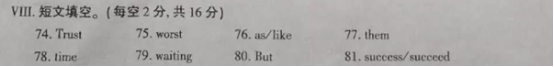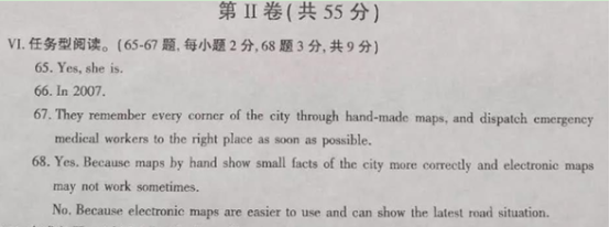 58. According to the passage, Soechting is ____.A. confident but busy B. humorous and lovelyC. wise but careless D. kind and hard-working59. The best title of the passage may be “____”.A. How to Save Wild Animals B. Soeching and Her Wild AnimalsC. Two Reticulated Giraffes D. A World Without Wild AnimalsV. 口语应用。(每小题1分,共5分)阅读下面对话,从方框内7个选项中选择5个恰当的句子完成此对话。A. What’s the matter?B. It will take you there.C. There is a parking lot(停车场) near the supermarket.D. How far is it from here?E. The road is too busy.F. I really can’t find a place to park my car.G. Well, you can do it like this...A: Excuse me, Madam. You can’t park in front of the shop.B: I’m so sorry. It’s my first time to drive alone. __60__.A: __61__ I think you can park there.B: __62__.A: About two kilometers.B: Thanks. Can you tell me the way there?A: You can use the guide map in your car. __63__B: But I don’t know how to use it! Can you help me?A: __64__ All right, it’s OK now.B: It’s very kind of you. Thank you so much!A: You are welcome.第II卷(共55分)VI. 任务型阅读。(65—67小题,每小题2分,68题3分,共9分)阅读下文并回答问题。In Jinzhong, Shanxi Province, there is a group of people who are busy drawing maps around. They are not workers on geography, but dispatchers(调度员) on Emergency(急救) Center of the city.Since 2007, the dispatchers in the center have been drawing maps of the local areas.“A dispatcher’s job is counted in seconds,” says Liang Ruimei, a dispatcher in the center. She has been working in ther center since it started in 2007. “We must answer the phone in 3 seconds, get clear information about the patient in 60 seconds and dispatch(调度) emergency medical workers in 3 minutes at most. If we save one second, the patient may have a better chance to live.” Although nowadays the center has electronic maps, the dispatchers still walk through the streets to draw maps by hand. After many years’ hard work, the dispatchers keep every building and street of the city in mind. They even know whether or not a car can enter the gate of a building. Sometimes the caller can’t tell clearly where he is, but it doesn’t matter. As long as he describes the buildings around, the dispatcher can dispatch emergency medical workers to him.“We are trying to be quicker than Death,” says Liang.65. Is Liang Ruimei a dispatcher in Emergency Center of Jinzhong? 66. When did Emergency Center of Jinzhong start? 67. To be quicker than Death, what do the dispatchers in Emergency Center of Jinzhong do? 68. Do you think it necessary for dispatchers to draw maps by hand when they have electronic maps? Why or why not? VII. 完成句子。(每空1分,共10分)根据所给提示,完成句子。每空一词,含缩略词。69. I am interested in writing.(改为否定句) I ____ ____ interested in writing.70. His grandparents live in Shanghai.(对划线部分提问) ____ ____ his grandparents live?71. I lent the book to Gina a few days ago.(改为同义句) Gina ____ the book ____ me a few days ago.72. 公园不远,我们可以步行去。(完成译句) The park is not far, and we can go there ____ ____.73. 父母和孩子们都在为美好的未来而努力。(完成译句) ____ parents ____ their kids are working hard for a better future.VIII. 短文填空。(每空2分,共16分)根据下面短文内容,在短文的空格处填上一个恰当的词,使短文完整、通顺。I recently turned 30. Thinking back what I’ve experienced, I took some time to write myself some advice.TrustEven if it kills your relationship. Even if you lose your friends. Even if it means you end up getting hurt. __74__ people even if they give you a reason not to.But don’t be too naive(幼稚). Some people are out to hurt you.PeoplePeople are the best and __75__ thing that will happen to you. Some will help you go further and faster. Others will pull you down to their level and make you lose.Most are OK. Many are average. Some are excellent. You don’t need a lot of people or friends around you. You need amazing people who help you just __76__ you help them. Only a few people will change your life forever. Find __77__.Value timeDon’t waste time on people who cheat you.Value other people’s __78__. Don’t be late. That means that if you’re late, you don’t care about them or their time. And that also means you think you’re worth more and therefore(因此) keep them __79__. Some people will tell you that it’s OK to be late. It’s not.Fail Fail. Fail a lot. Fail often. Fail in making friends. Fail in work. __80__ please don’t lose your heart! Learn a lesson.If you don’t learn something when you fail, then all you’ve done is failed. If you learn something, then you’ve grown. Every time you grow and fail and learn, you become better at finding out the way to __81__.IX. 书面表达。(满分20分)你正在组织一项暑假期间到山区为期一周的游学和帮扶活动。作为发起人,请你写一篇发言稿,在你校“英语时光”广播中号召更多的同学参加。要求:1. 80—100词,开头和结尾已给出,不计入总词数。文中不能出现自己的姓名和所在学校的名称。参考信息:活动缘由(孤独、帮扶、游学……)活动构想(时间、地点、内容……)……Hello, everybody. I am planning a summer trip called “Be a Kid in the Mountain”._________ Thank you! 答案