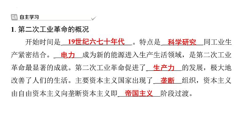 1. 第二次工业革命的概况开始时间是 。特点是 同工业生 产紧密结合。 成为新的能源进入生产生活领域,是第二次工业 革命最显著的成就。第二次工业革命促进了 的发展,极大地 改善了人们的生活。主要资本主义国家出现了 组织,资本主义 由自由资本主义向垄断资本主义即 阶段过渡。