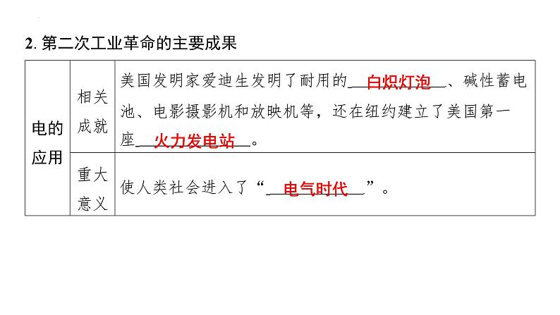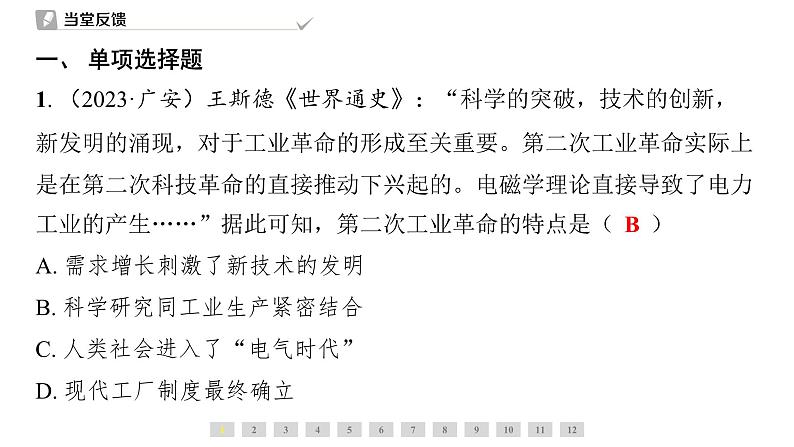 1. (2023·广安)王斯德《世界通史》:“科学的突破,技术的创新, 新发明的涌现,对于工业革命的形成至关重要。第二次工业革命实际上 是在第二次科技革命的直接推动下兴起的。电磁学理论直接导致了电力 工业的产生……”据此可知,第二次工业革命的特点是( B )