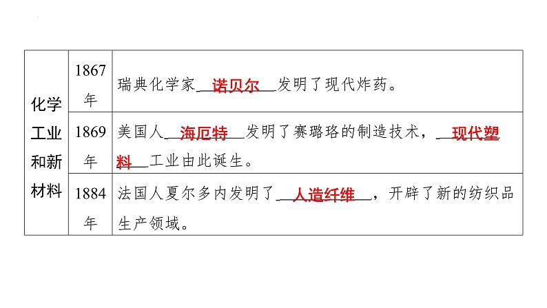 8. 下表是第二次工业革命中一系列发明的简表(部分)。由此可见,第 二次工业革命的特点是( D )
