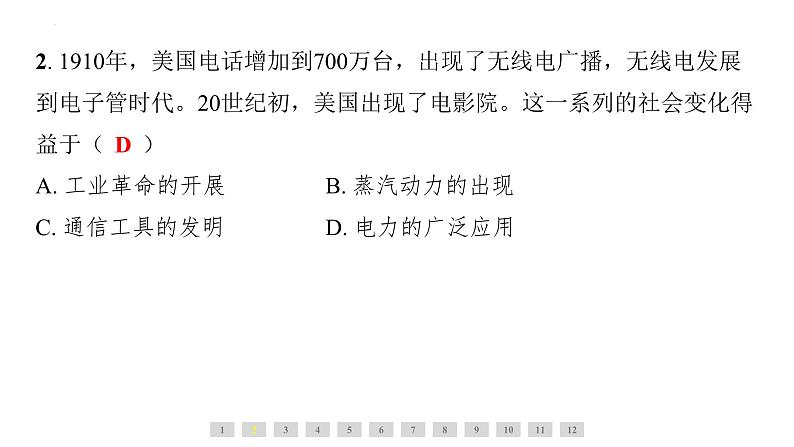 2. 1910年,美国电话增加到700万台,出现了无线电广播,无线电发展 到电子管时代。20世纪初,美国出现了电影院。这一系列的社会变化得 益于( D )