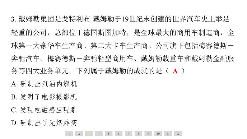 3. 戴姆勒集团是戈特利布·戴姆勒于19世纪末创建的世界汽车史上举足 轻重的公司,总部位于德国斯图加特,是全球最大的商用车制造商,全 球第一大豪华车生产商、第二大卡车生产商。公司旗下包括梅赛德斯- 奔驰汽车、梅赛德斯-奔驰轻型商用车、戴姆勒载重车和戴姆勒金融服 务等四大业务单元。下列属于戴姆勒的成就的是( A )