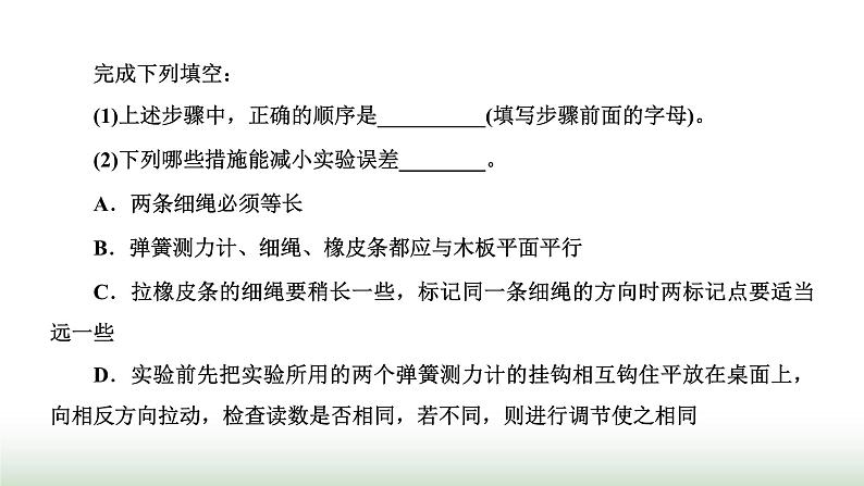 完成下列填空:(1)上述步骤中,正确的顺序是__________(填写步骤前面的字母)。(2)下列哪些措施能减小实验误差________。A.两条细绳必须等长B.弹簧测力计、细绳、橡皮条都应与木板平面平行C.拉橡皮条的细绳要稍长一些,标记同一条细绳的方向时两标记点要适当远一些D.实验前先把实验所用的两个弹簧测力计的挂钩相互钩住平放在桌面上,向相反方向拉动,检查读数是否相同,若不同,则进行调节使之相同 [对点训练]2.某同学在“探究弹簧弹力与形变量的关系”的实验中,测得图中弹簧OC的劲度系数为500 N/m。如图甲所示,用弹簧OC和弹簧测力计a、b做“探究两个互成角度的力的合成规律”实验,在保持弹簧在竖直方向上伸长量为1.00 cm不变的条件下。(1)若弹簧测力计a、b间夹角为90°,弹簧测力计a的读数如图乙所示,为______N,则理论上弹簧测力计b的读数应为______N。(保留两位有效数字)(2)若开始时弹簧测力计a、b间夹角大于90°,保持弹簧测力计a与弹簧OC的夹角不变,缓慢移动弹簧测力计b,不断减小弹簧测力计b与弹簧测力计a的夹角,则弹簧测力计a的读数____________,弹簧测力计b的读数____________。答案:(1)3.0 4.0 (2)变小 先变小后变大、