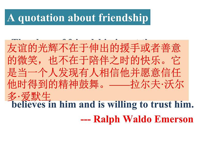 友谊的光辉不在于伸出的援手或者善意的微笑,也不在于陪伴之时的快乐。它是当一个人发现有人相信他并愿意信任他时得到的精神鼓舞。——拉尔夫·沃尔多·爱默生