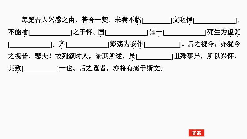 答案 7.况修短随化 终期于尽8.或取诸怀抱 悟言一室之内 或因寄所托 放浪形骸之外9.当其欣于所遇 暂得于己 快然自足 不知老之将至