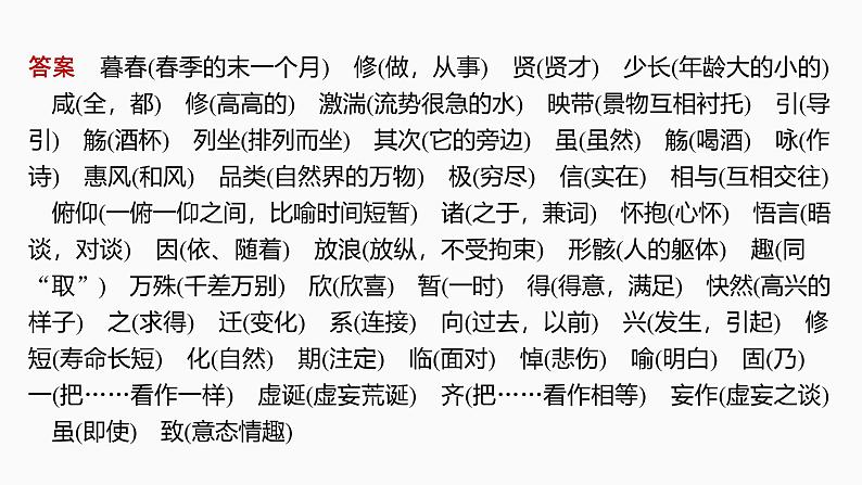 答案 暮春(春季的末一个月) 修(做,从事) 贤(贤才) 少长(年龄大的小的) 咸(全,都) 修(高高的) 激湍(流势很急的水) 映带(景物互相衬托) 引(导引) 觞(酒杯) 列坐(排列而坐) 其次(它的旁边) 虽(虽然) 觞(喝酒) 咏(作诗) 惠风(和风) 品类(自然界的万物) 极(穷尽) 信(实在) 相与(互相交往) 俯仰(一俯一仰之间,比喻时间短暂) 诸(之于,兼词) 怀抱(心怀) 悟言(晤谈,对谈) 因(依、随着) 放浪(放纵,不受拘束) 形骸(人的躯体) 趣(同“取”) 万殊(千差万别) 欣(欣喜) 暂(一时) 得(得意,满足) 快然(高兴的样子) 之(求得) 迁(变化) 系(连接) 向(过去,以前) 兴(发生,引起) 修短(寿命长短) 化(自然) 期(注定) 临(面对) 悼(悲伤) 喻(明白) 固(乃) 一(把……看作一样) 虚诞(虚妄荒诞) 齐(把……看作相等) 妄作(虚妄之谈) 虽(即使) 致(意态情趣)