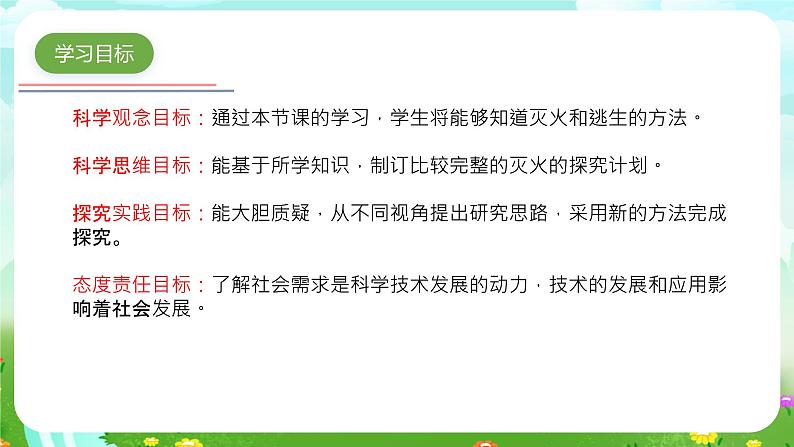科学观念目标:通过本节课的学习,学生将能够知道灭火和逃生的方法。科学思维目标:能基于所学知识,制订比较完整的灭火的探究计划。探究实践目标:能大胆质疑,从不同视角提出研究思路,采用新的方法完成探究。态度责任目标:了解社会需求是科学技术发展的动力,技术的发展和应用影响着社会发展。